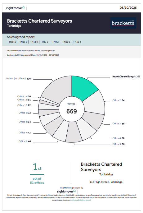 This outstanding achievement, confirmed by the latest Rightmove sales agreed report, places Bracketts Tonbridge firmly at the top of the local property market, ranking Top Estate Agent in Tonbridge out of 61 estate agency offices in the area, with 101 sales agreed year-to-date.
