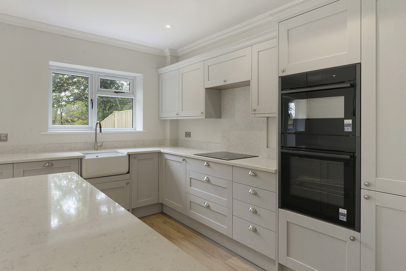 Bespoke painted wood kitchen with matt lacquered doors and quartz worktops