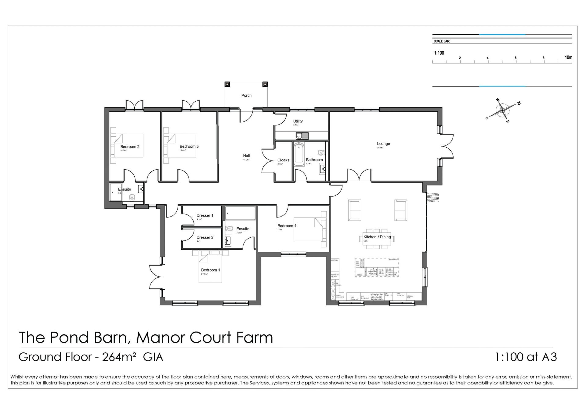 The Pond Barn is a new build single storey dwelling, comprises an entrance hall, sitting room with a woodburning stove, large kitchen dining room, utility room, bathroom, main bedroom with two walk in dressing rooms with double robes, three further bedrooms, one with an en suite bathroom.