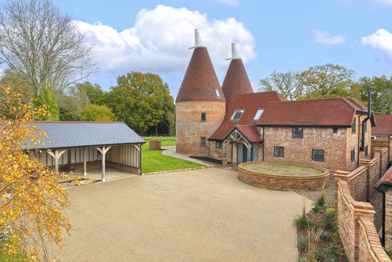 The Oast House. which is in the process of being renovated, comprises on the ground floor an entrance hall/reception space, reception room, kitchen and dining room roundels, utility room, cloakroom, whilst on the first floor there are four bedrooms (two in the roundels) both of which have en suites, plus there is a family bathroom. There is a three bay open garage and 0.7 acre landscaped garden.