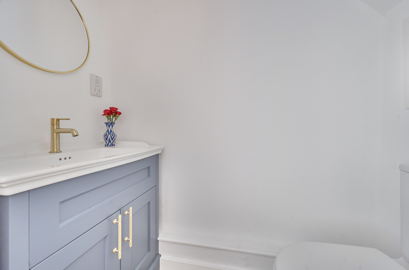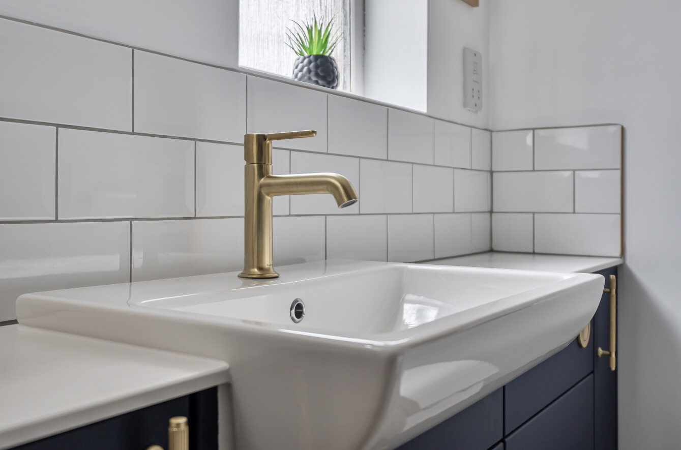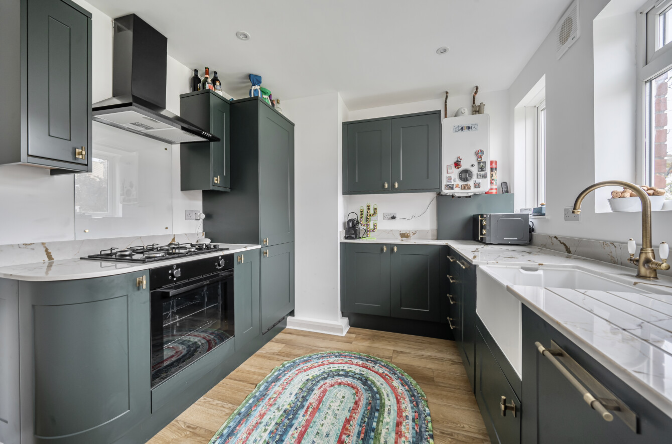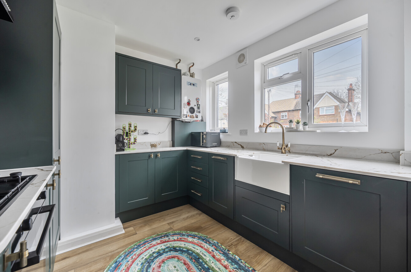The accommodation comprises entrance hall leading through to a bright and spacious dual aspect sitting/dining room. The modern contemporary emerald green kitchen with contrasting white quartz work surface and feature butler sink, while the ground floor also features a stylish family bathroom complete with a freestanding bath and separate shower cubicle. Inner hall leads to a useful outbuilding currently arranged as a utility room, offering additional practical space.