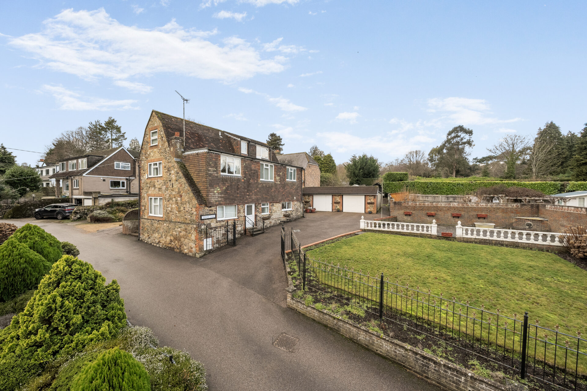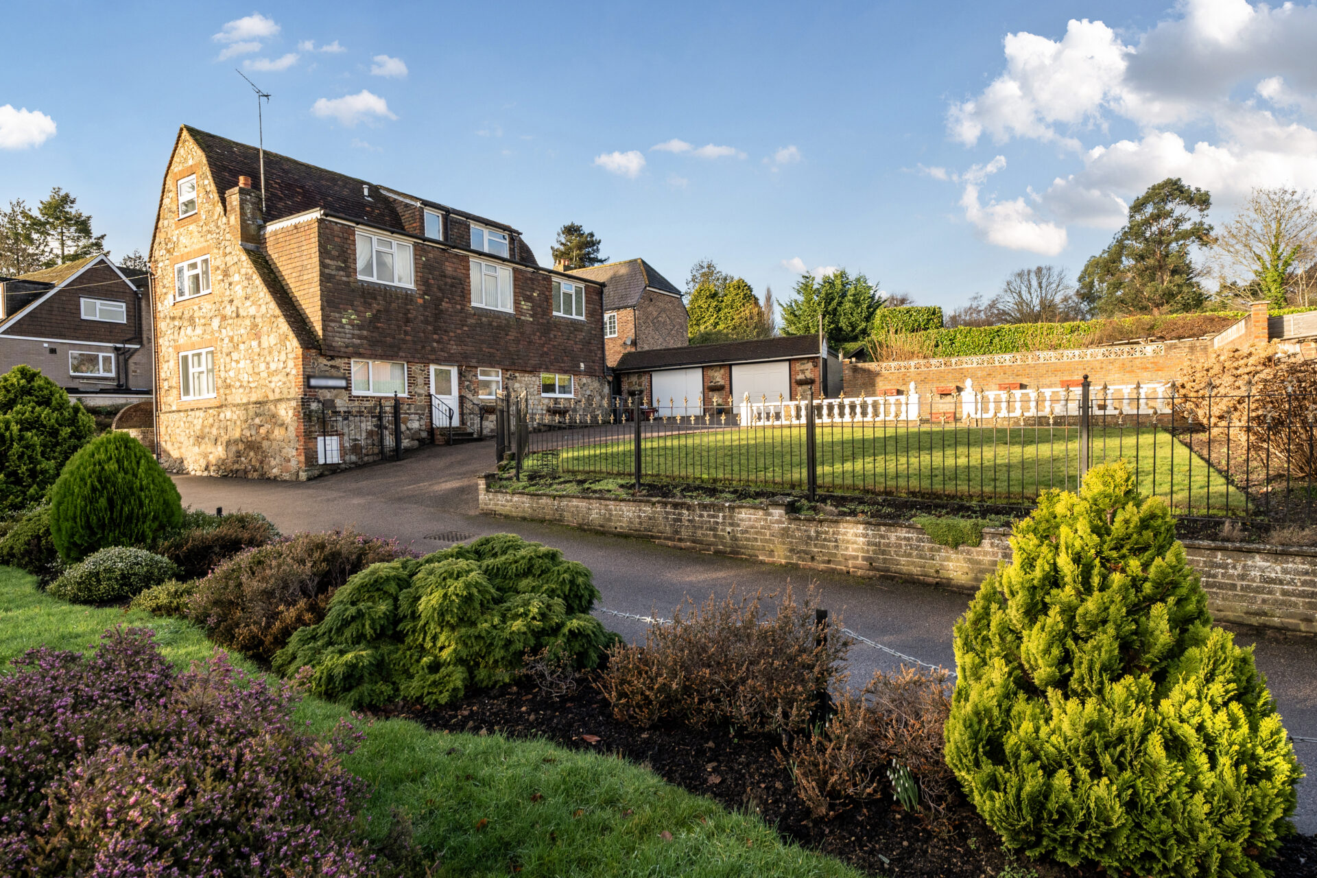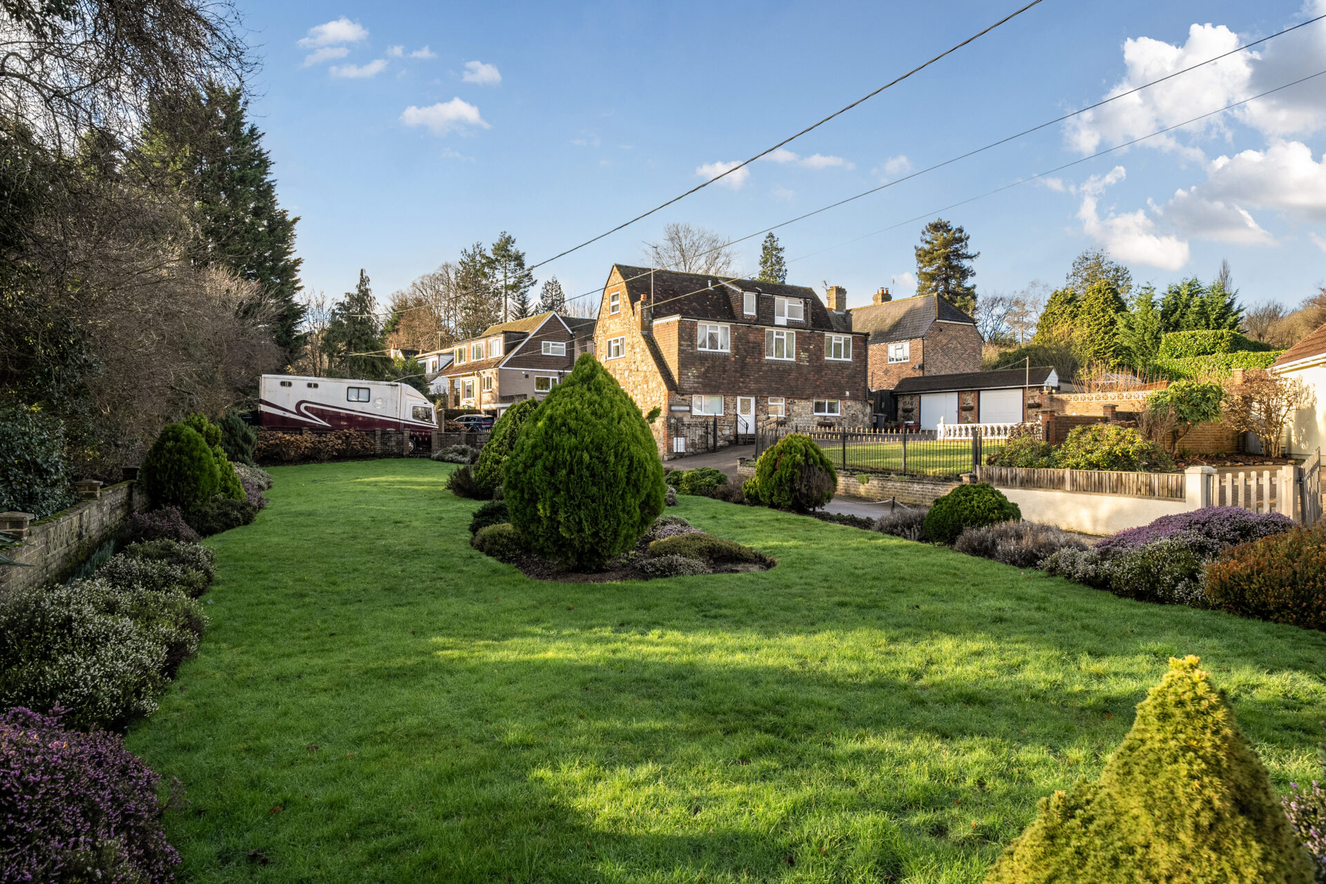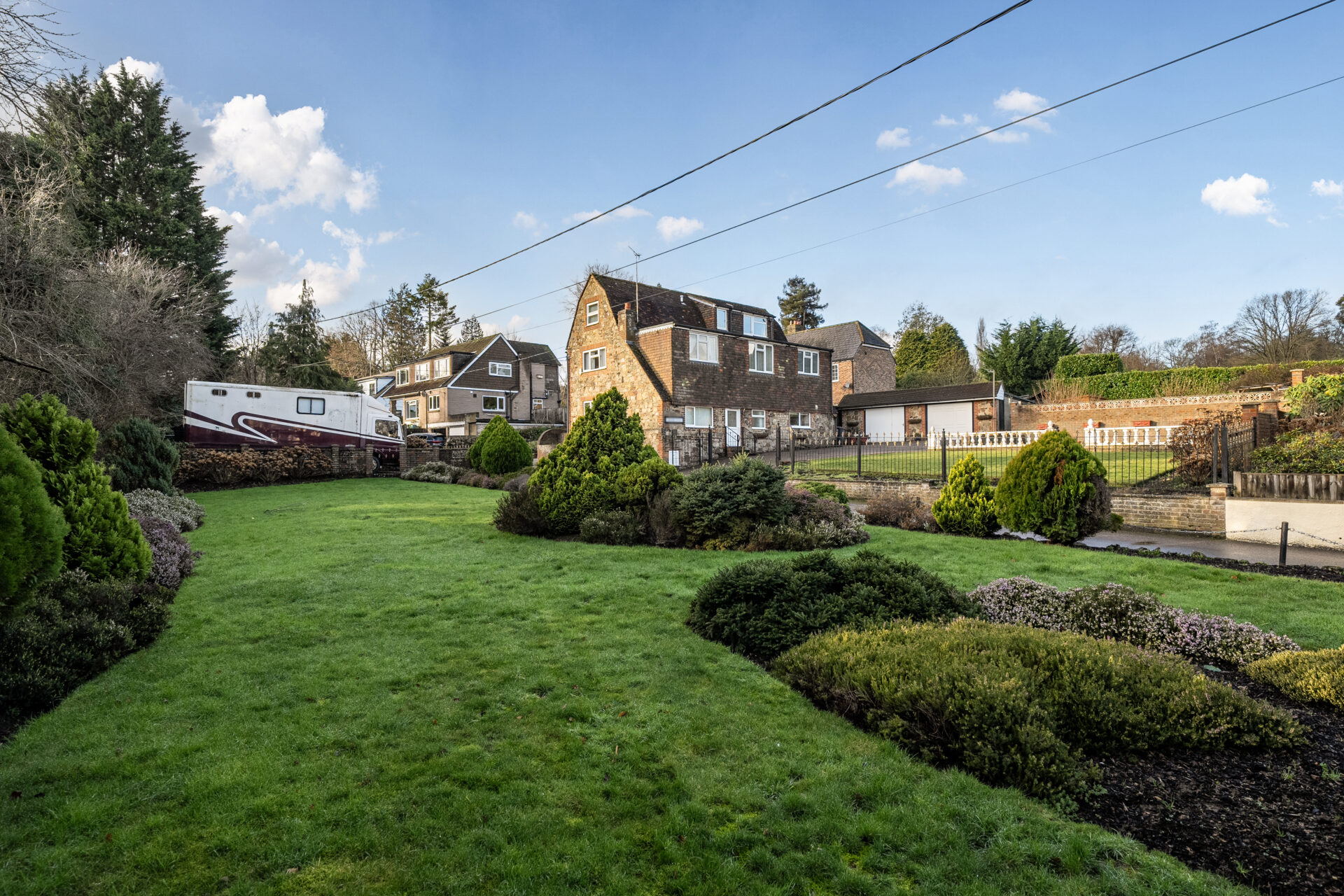 To the front, as shown in the photographs, the property features a beautifully maintained front garden mainly laid to lawn with mature shrubs, trees, and well-stocked borders, along with additional parking and a detached stable block. Subject to the necessary planning consents, there is potential to re-site the garage or explore the creation of an annex, making it suitable for blended or multi-generational living.
