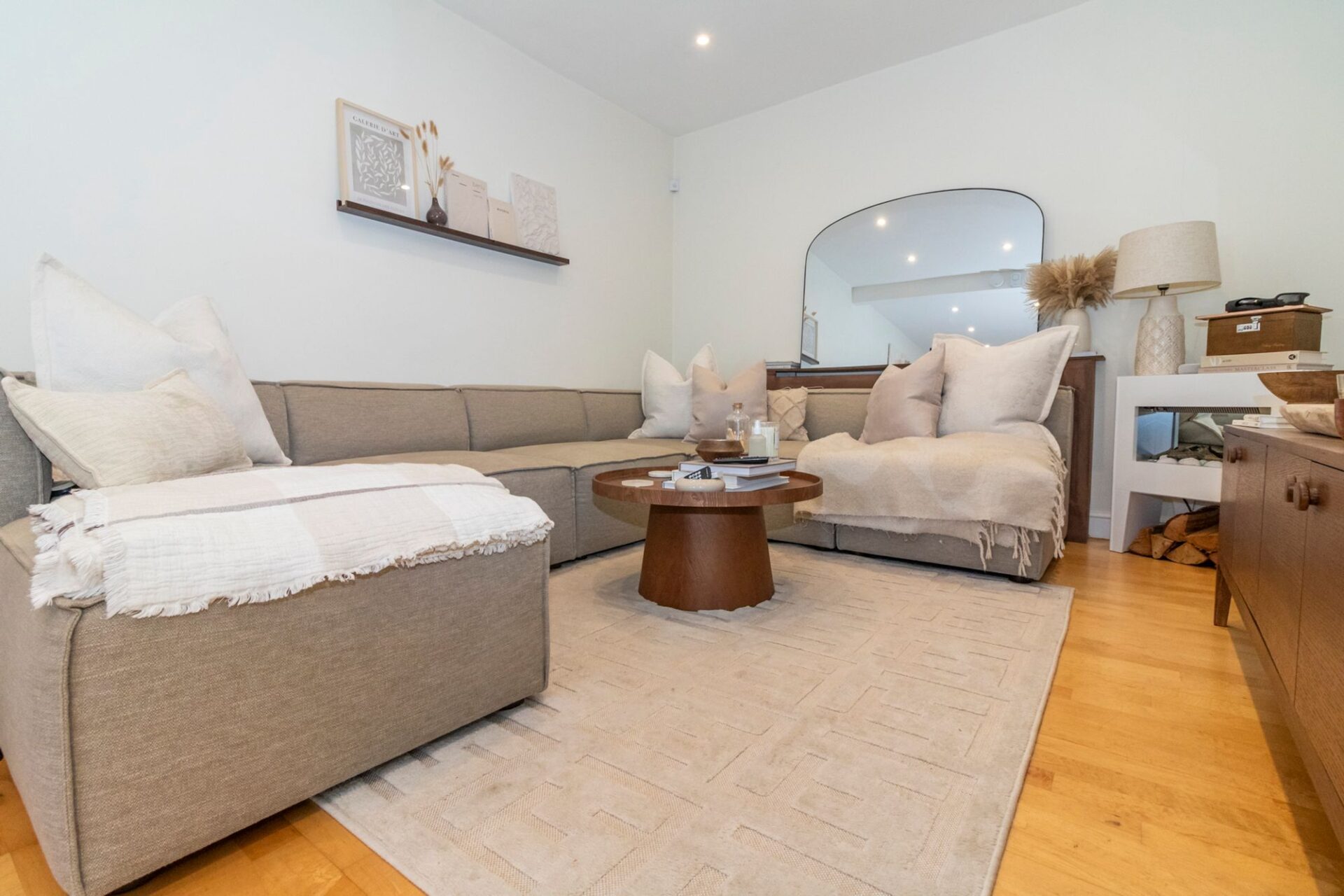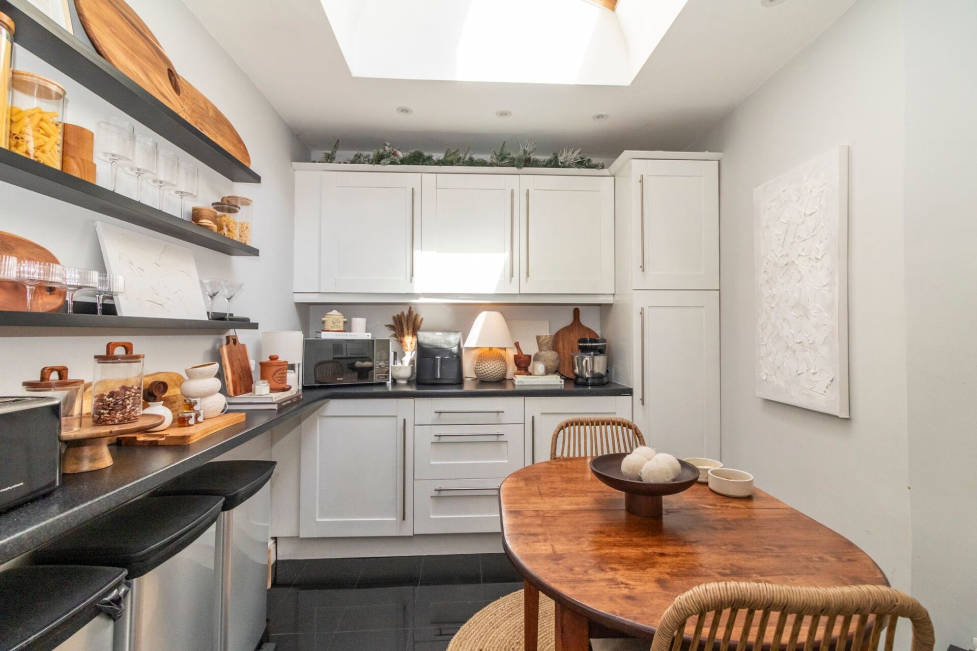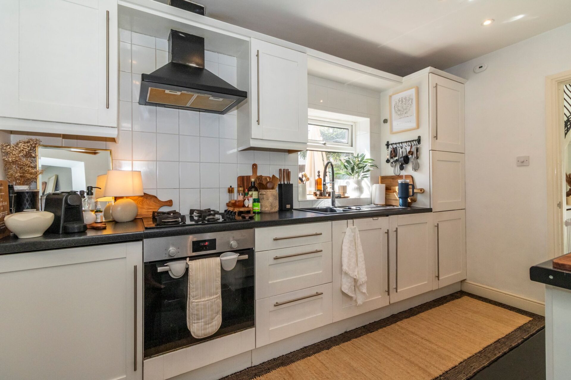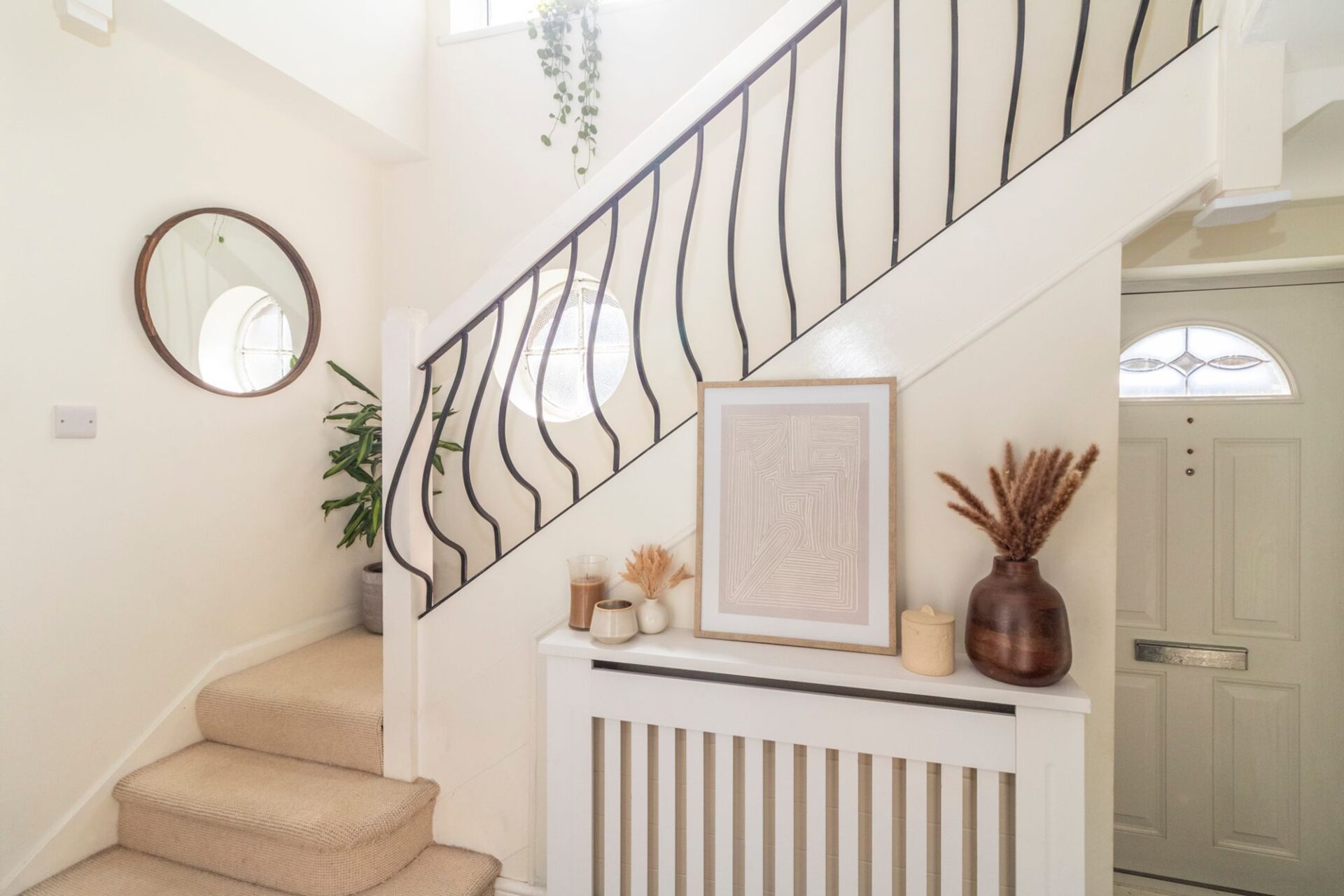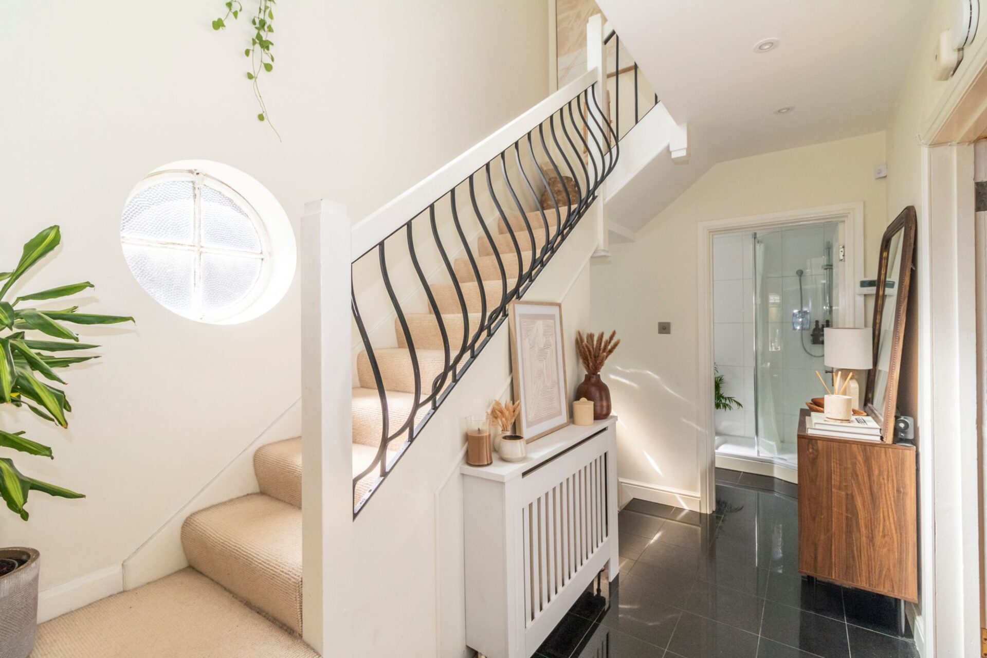 The generous hallway has a porthole window and a wrought-iron staircase which lends a spacious feel to the hall, stairs and landing.