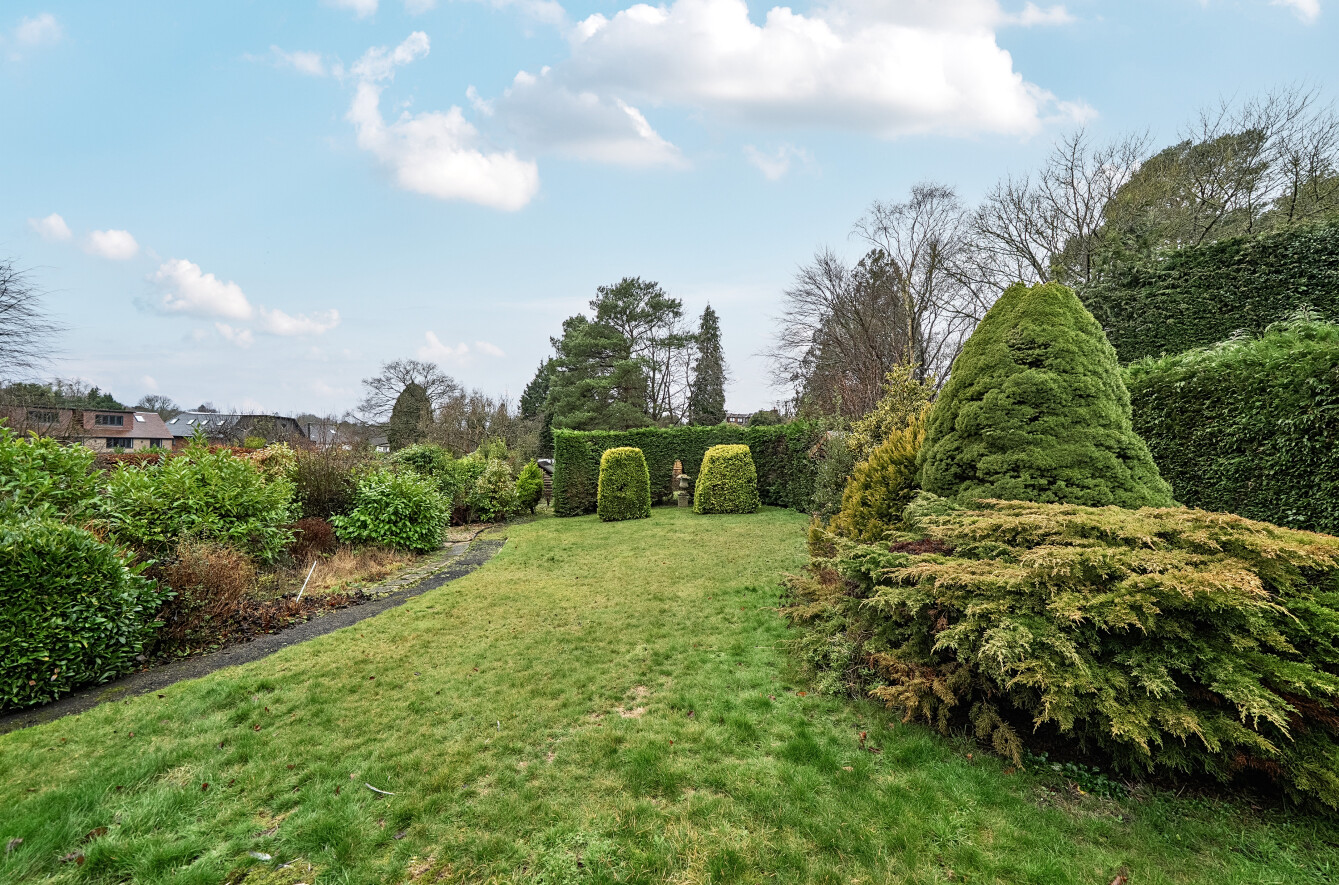 To the front, alongside an attached Single Garage and Driveway, there is an area of garden. To the opposite flank, a footpath, two integral Garden Stores, which open to the Rear Garden a delightful feature of the property enjoying a south-westerly aspect, extending in total 12 feet, with assorted terraces, lawns, and established beds and borders.