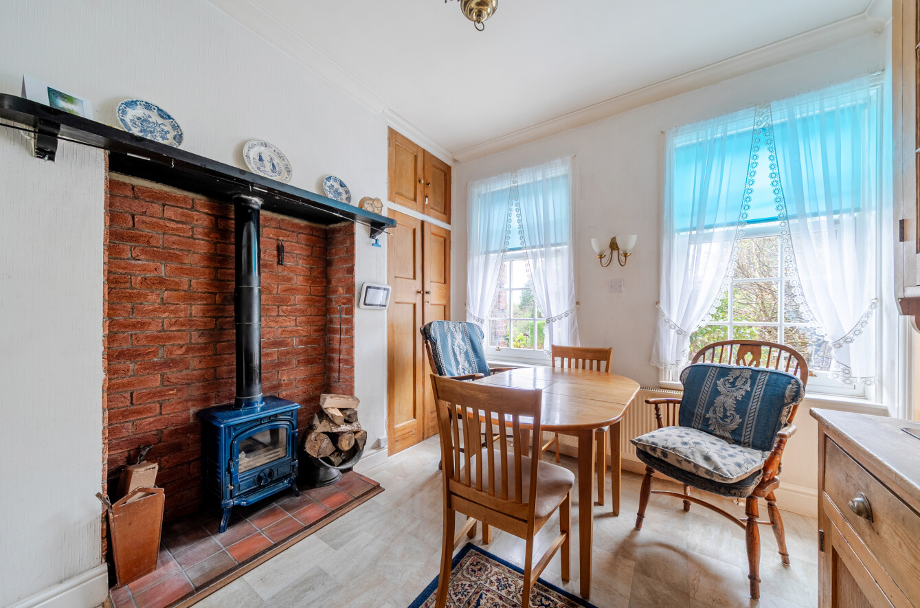 A rare opportunity to acquire a chain free Double Fronted property, constructed in Georgian style and featuring Gas Central Heating, striking and generous Hallway with turning staircase, Cloakroom/WC, through Living Room with fireplace, Dining Room with a bay window and doors to the Rear Garden, Kitchen, Breakfast Room.
