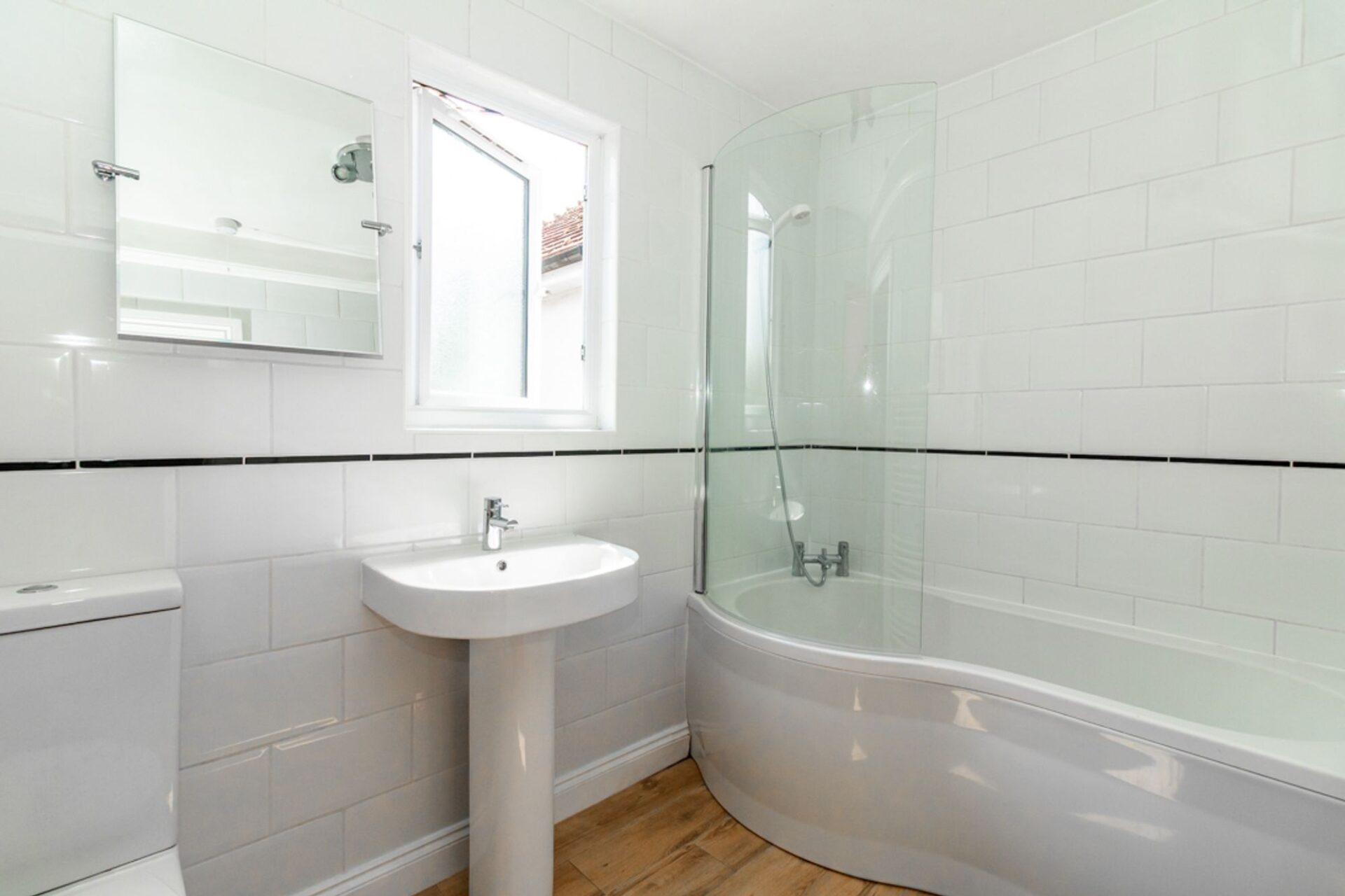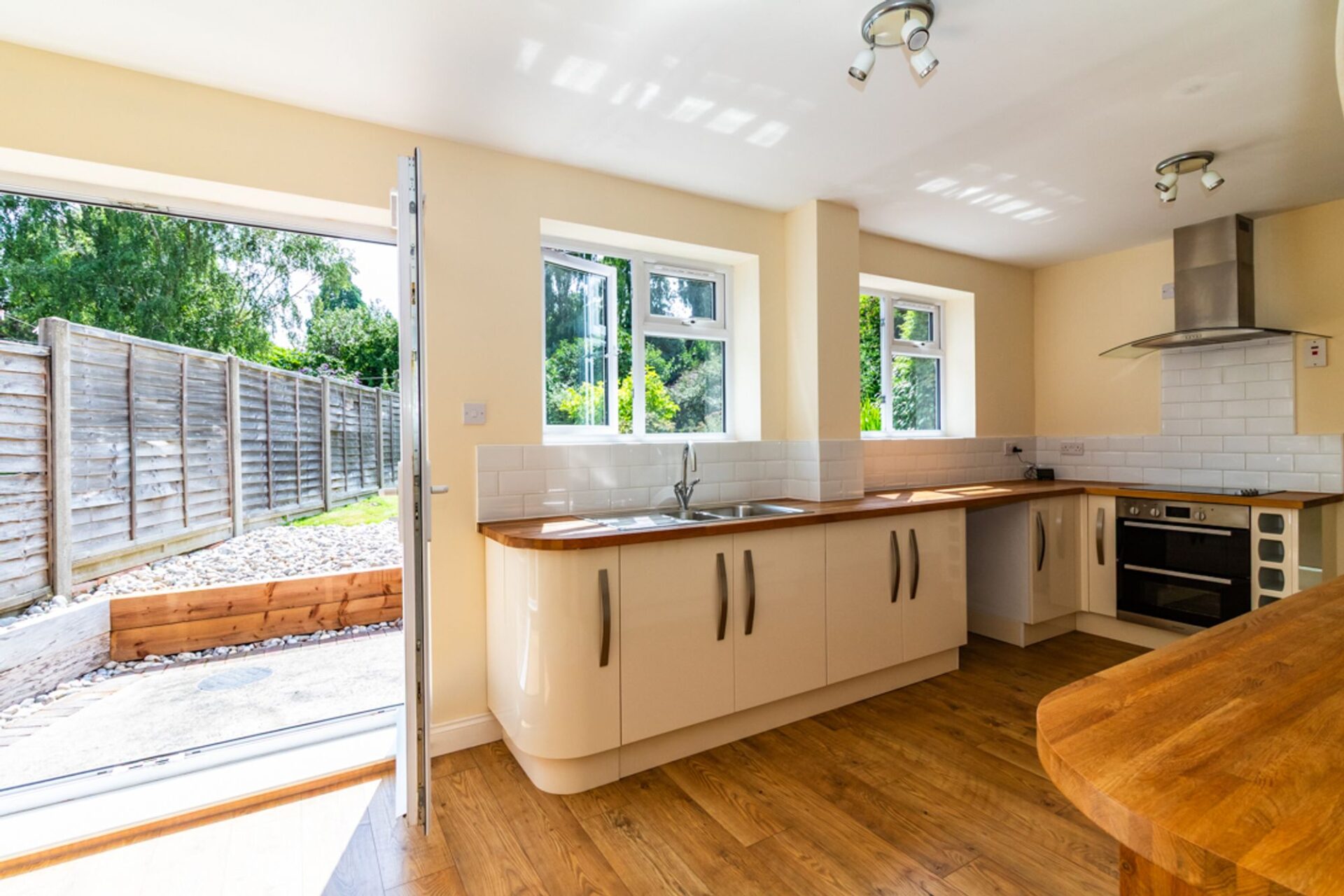 The property benefits from a spacious through reception room featuring large windows, a feature fireplace, and wood-effect flooring. This leads seamlessly into the generous kitchen/dining room, fitted with a stylish modern kitchen including real wood worktops. French doors and windows overlook the large, well-stocked garden, which is home to mature trees and shrubs and offers an ideal setting for outdoor living.