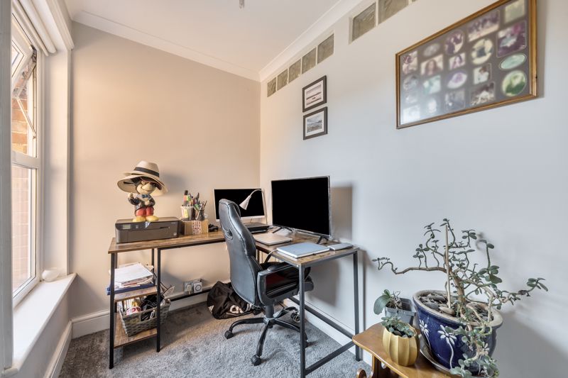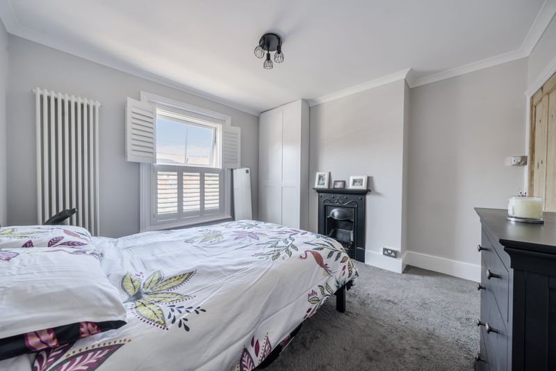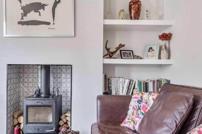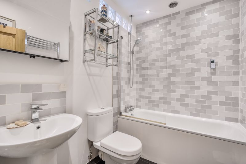 First Floor comprises three bedrooms and the house bathroom. The first bedroom is to the left of a sealed brick exposed wall. It has a pretty feature fireplace, with a double fitted wardrobe to one alcove and access to the generous bulkhead storage above the stairs. The second bedroom lies to the back of the property with similar dimensions, another larger double fitted wardrobe and feature fireplace. The third, smallest bedroom is adjacent to the second, currently used as an office, offering plenty of sunlight with room for a bed and storage. The upstairs bathroom consists of floor and generous wall tiling, a chrome heated towel rail, bath with a separately installed overhead electric WiFi operated shower, and W/C with wash basin.