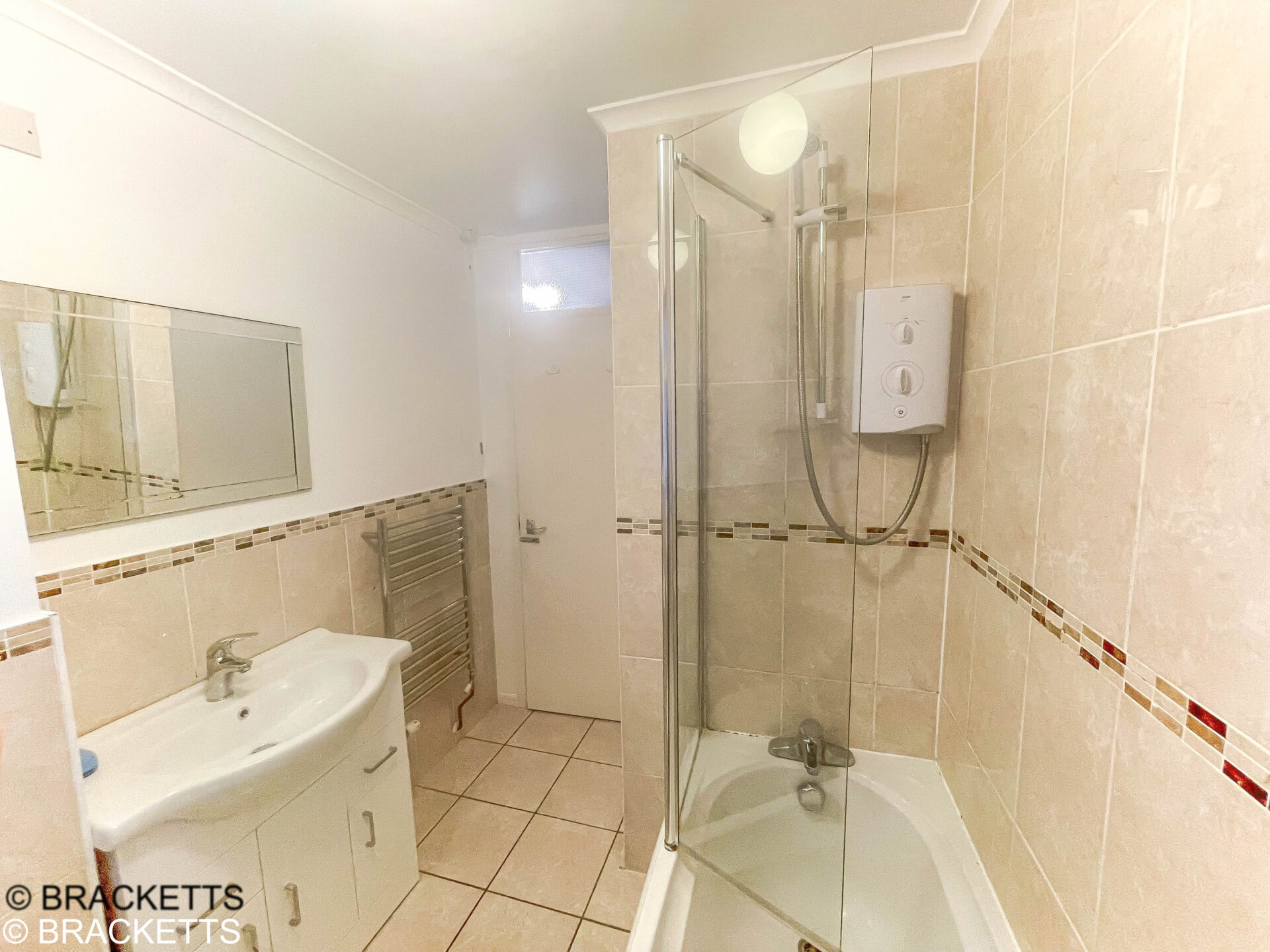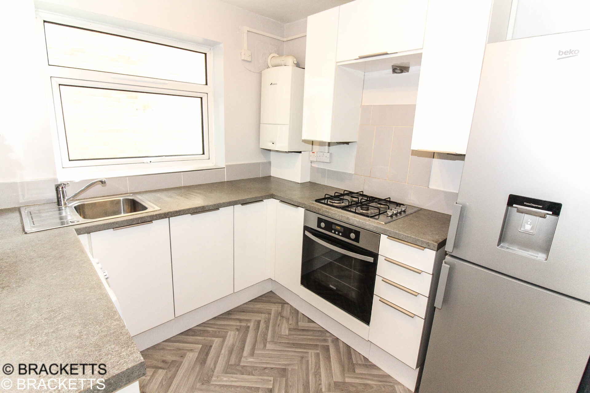 The modern kitchen stands out with its stylish units, integrated oven and gas hob, and elegant herringbone flooring, offering both functionality and a touch of sophistication. A freestanding fridge freezer with water dispenser and an integrated washing machine in the utility area add further convenience for daily living. The bathroom is finished to a high standard, featuring a sleek bath with an integrated shower, chic tiled walls, and a large mirror that enhances the sense of space. Additional amenities such as a heated towel rail and a vanity unit provide comfort and smart storage solutions. The flat benefits from radiator heating throughout, ensuring a cosy environment all year round.
