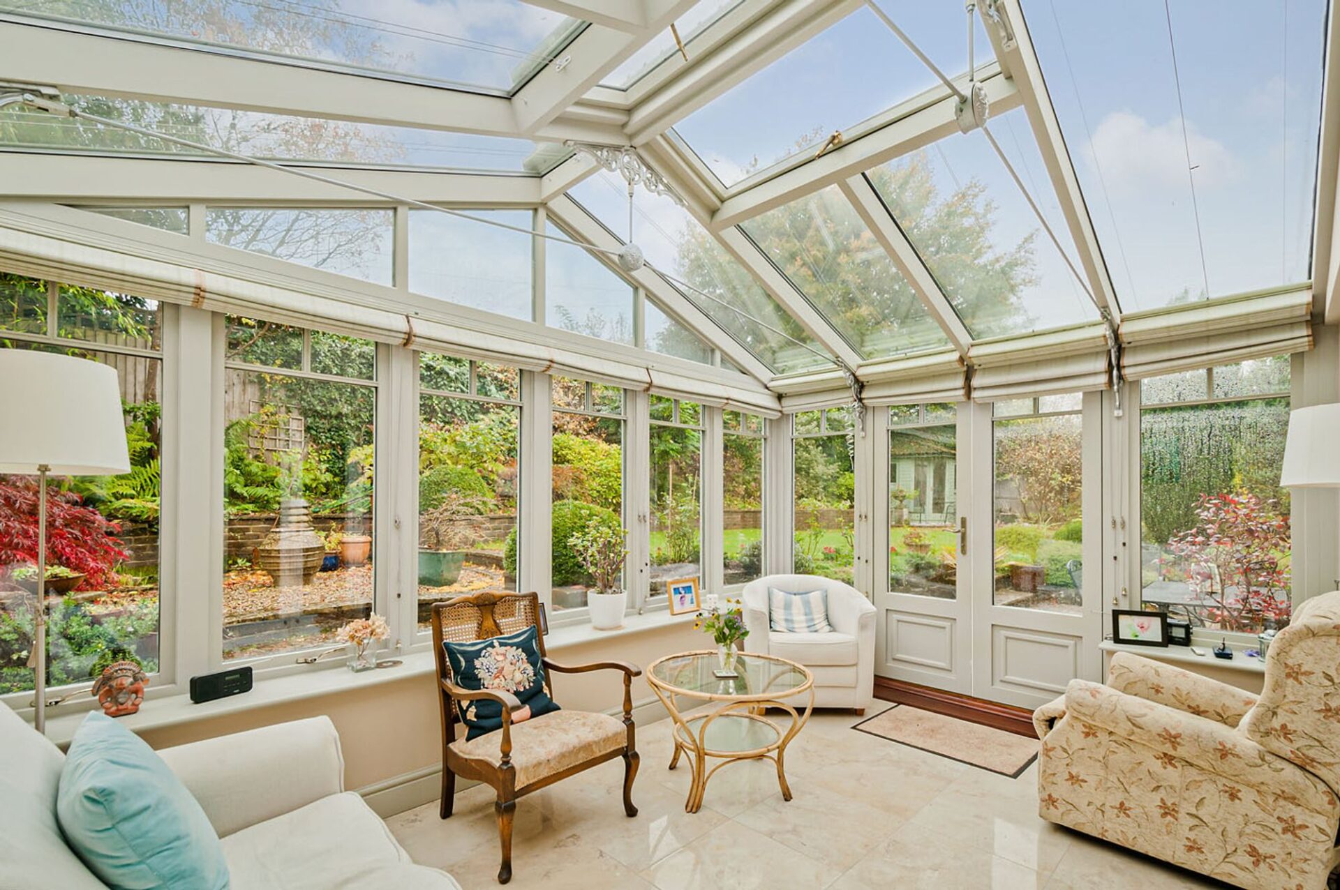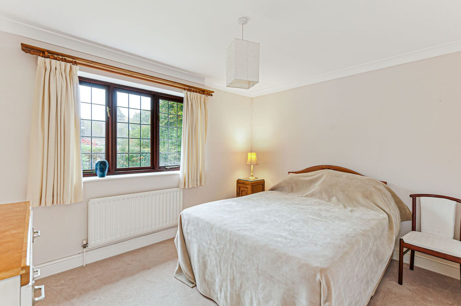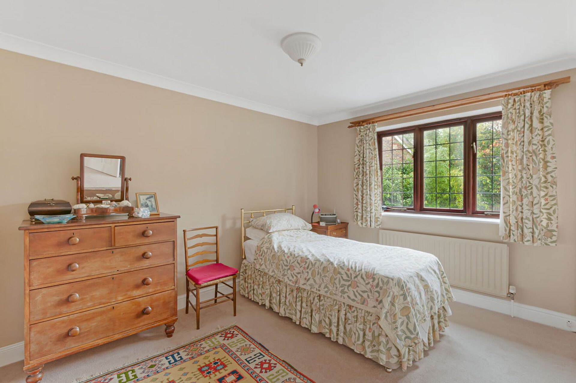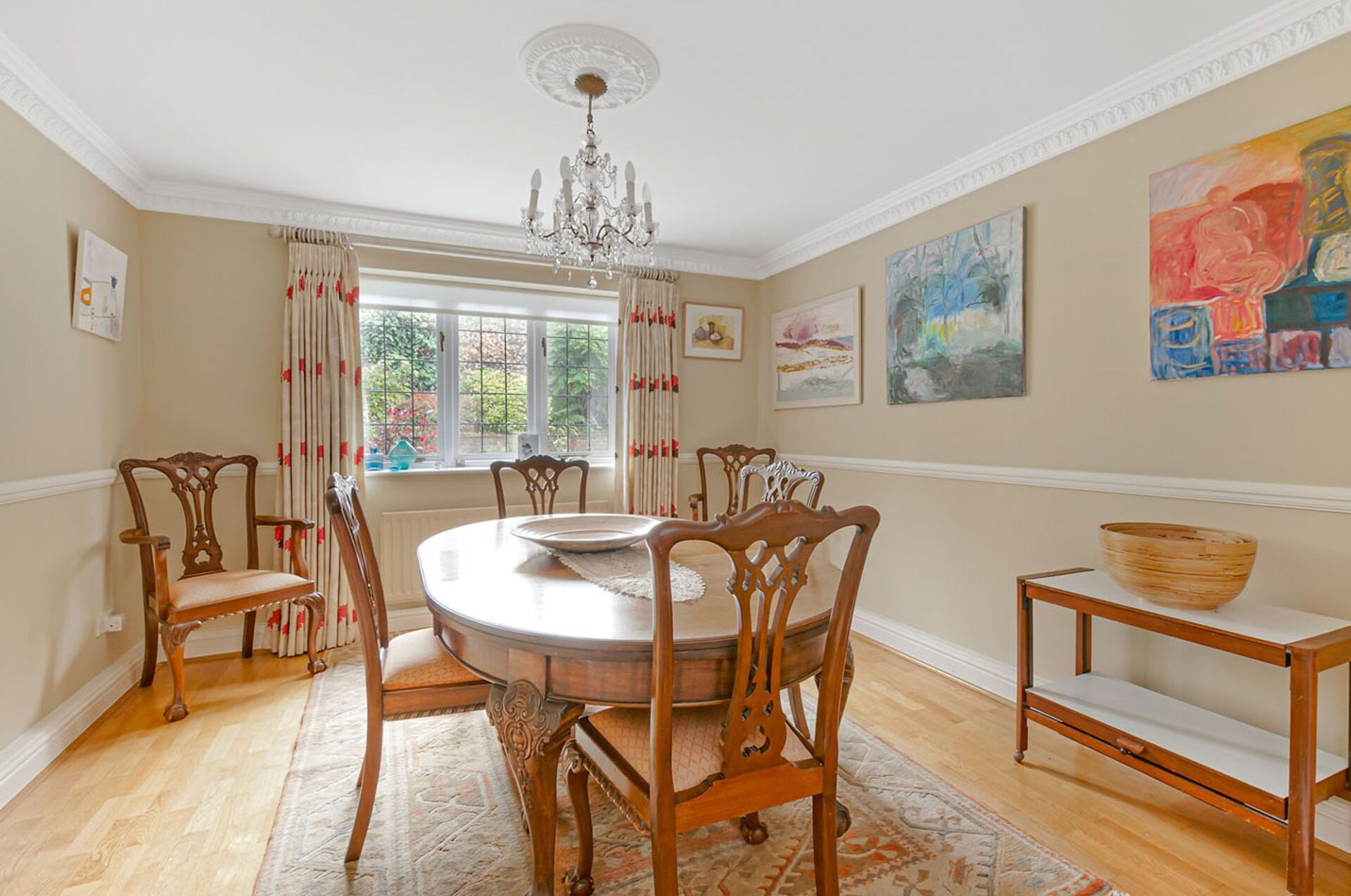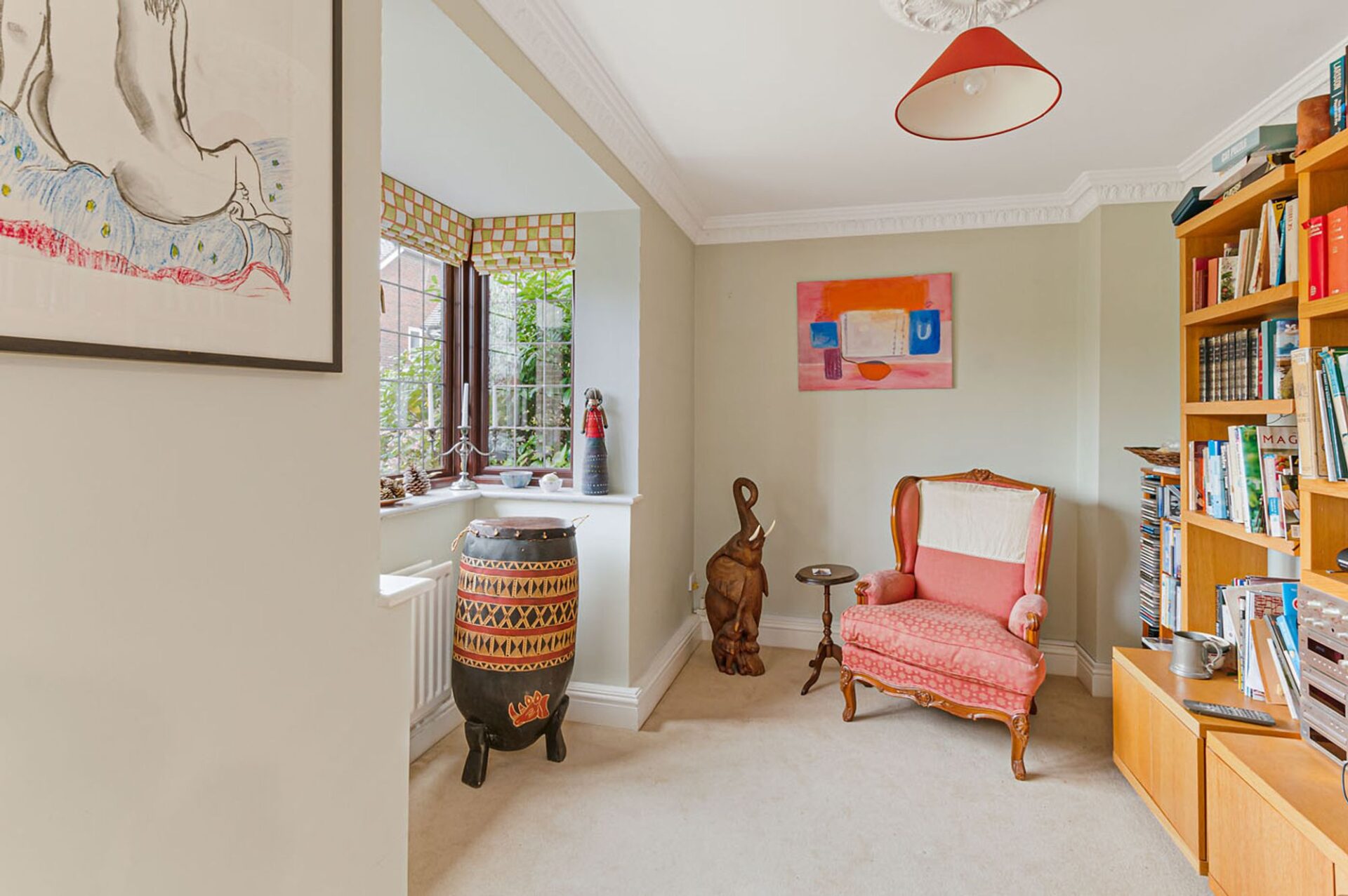 Forming part of an exclusive cul de sac of just six properties originally constructed by Berkeley Homes, this generously proportioned detached house has a striking Tudor style gable to its front elevation and has been enhanced by the addition of a spacious conservatory to the rear. The accommodation, which has gas central heating and double glazing comprises, to the ground floor, spacious hallway, cloakroom/WC, a study, sitting room minster-style fireplace with mantel and hearth, conservatory with a pitched glazed roof, underfloor heating and doors to garden, dining room, kitchen breakfast room with underfloor heating, hand painted wooden units, L-shaped suite of granite work service inset with sink and AEG induction hob, integrated appliances, double oven in housing unit with adjacent fridge freezer, pantry cupboard, twin aspects and double doors to rear garden, utility/laundry. Upstairs is a generous landing with hatch to loft and airing cupboard. The principal bedroom has fine views from the front elevation, assorted recess wardrobe cupboards and a spacious en suite shower room. There is a second bedroom with an en suite shower and three further bedrooms plus a family bathroom and WC. A generous driveway provides access to an integral double garage with twin ‘up and over’ doors, light and power. The rear garden is an attractive feature of the property and enjoys a southerly aspect with wide paved seating areas, a wrap-around lawn and a pretty timber insulated, double glazed studio/home office with light and power plus a separated garden shed.