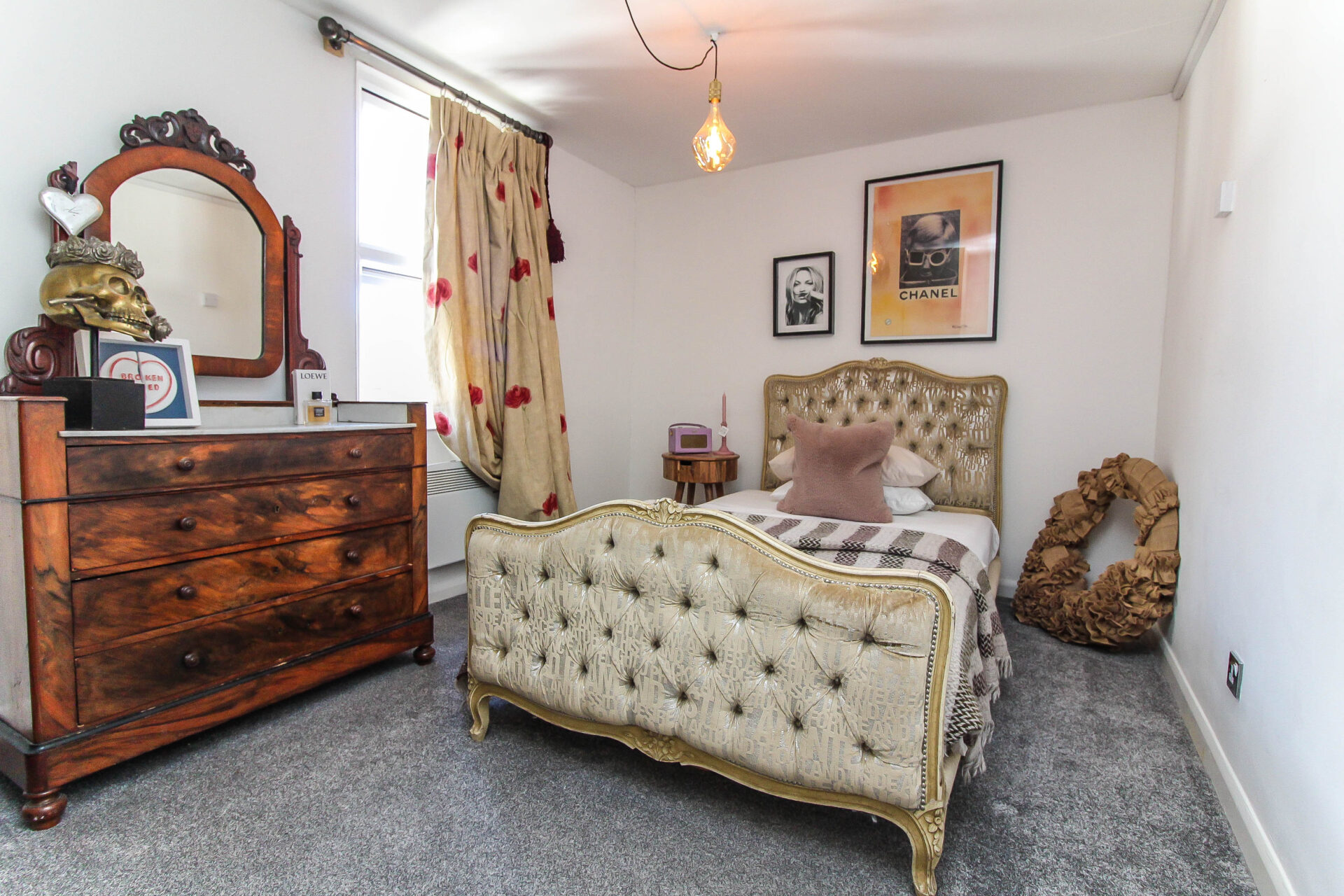 The accommodation comprises a spacious double bedroom with built-in wardrobes, alongside a second, smaller bedroom that is ideally suited as a guest room or home office. The bathroom features a distinctive retro-style turquoise suite, complete with a bath, overhead shower, and glass shower screen.