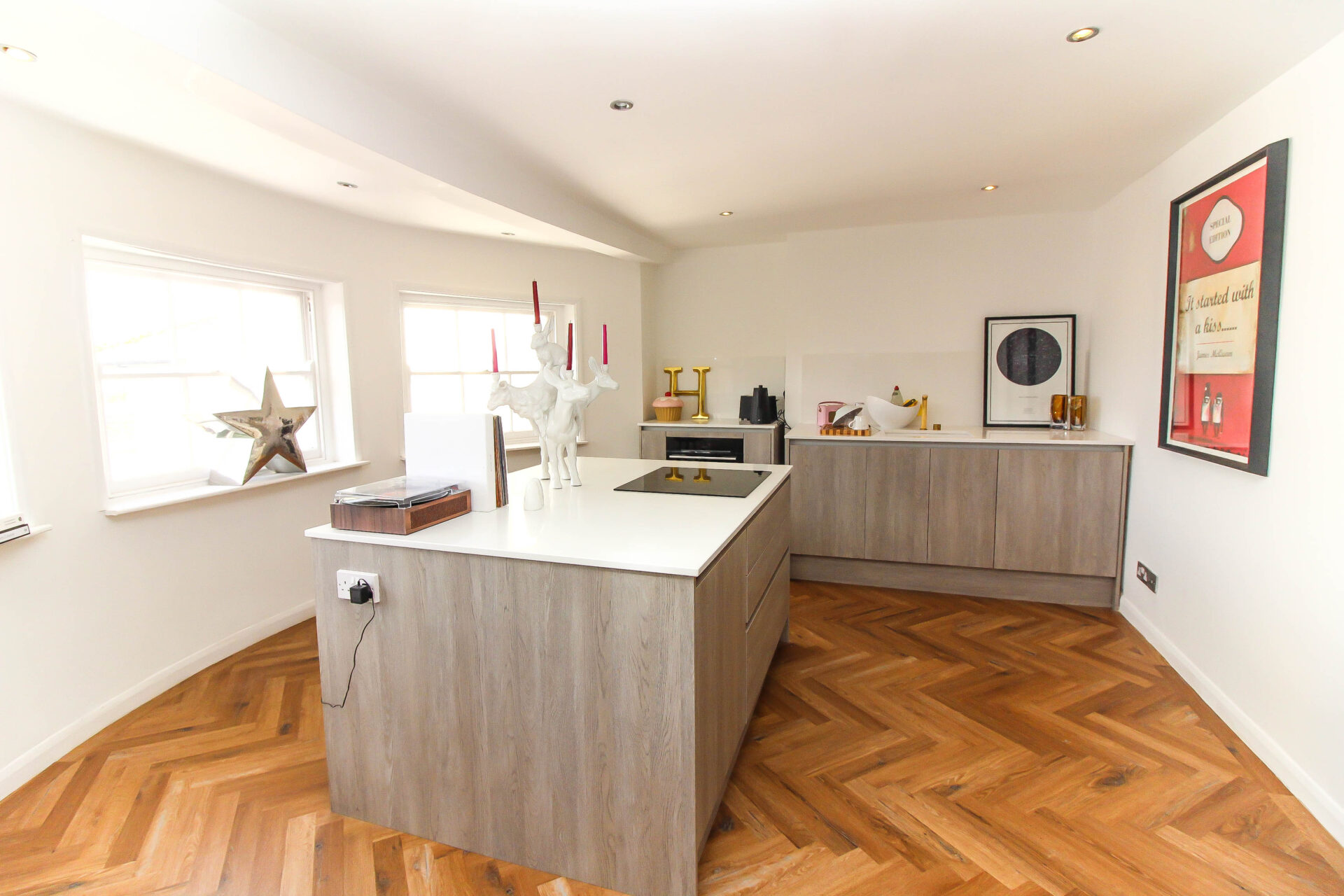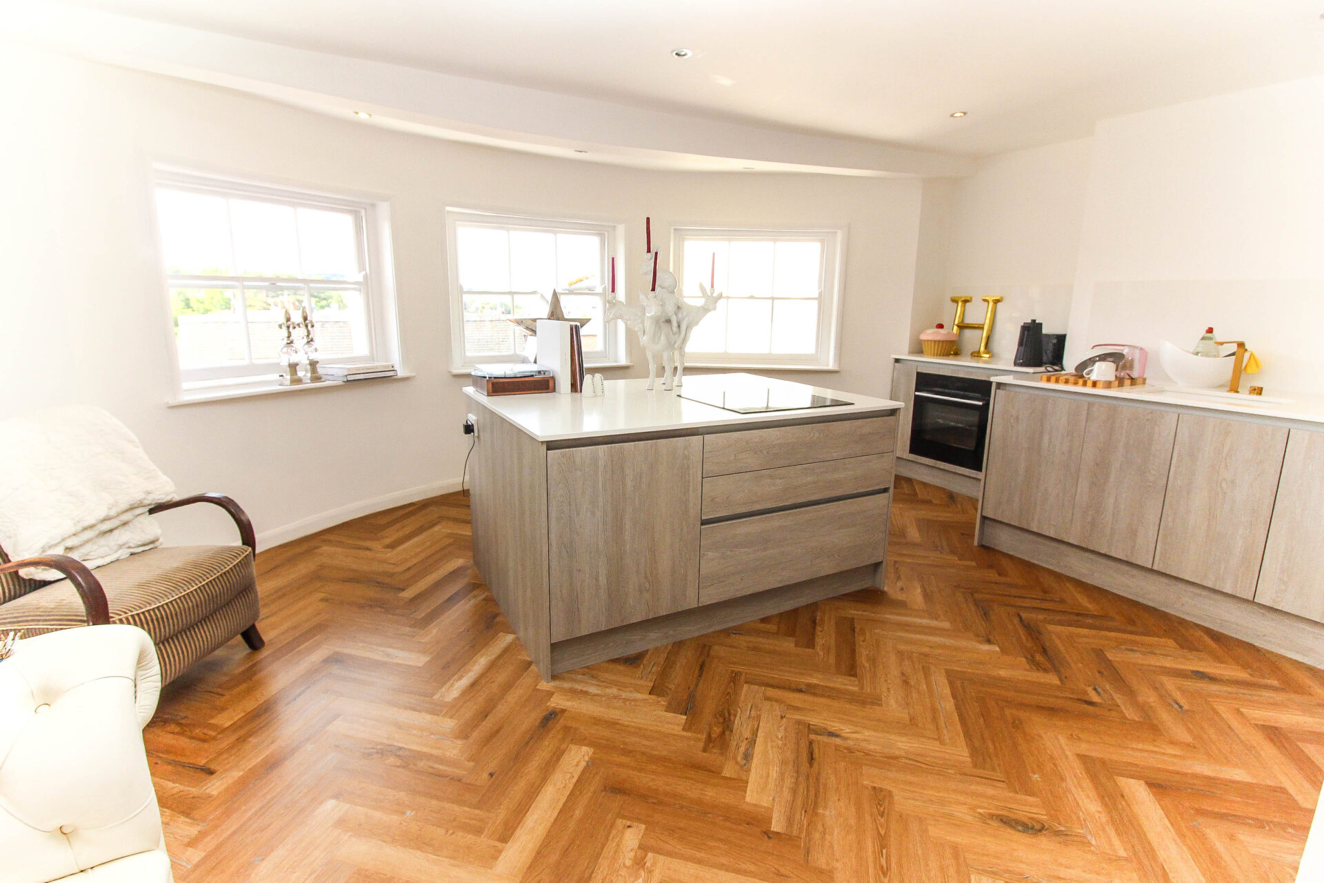Upon entering, you are welcomed by elegant herringbone Amtico flooring, which flows through to the open-plan living and kitchen area. The contemporary kitchen is well-equipped with an induction hob, Bosch oven/grill/air fryer, dishwasher, washer/dryer, and an under-counter fridge with icebox.