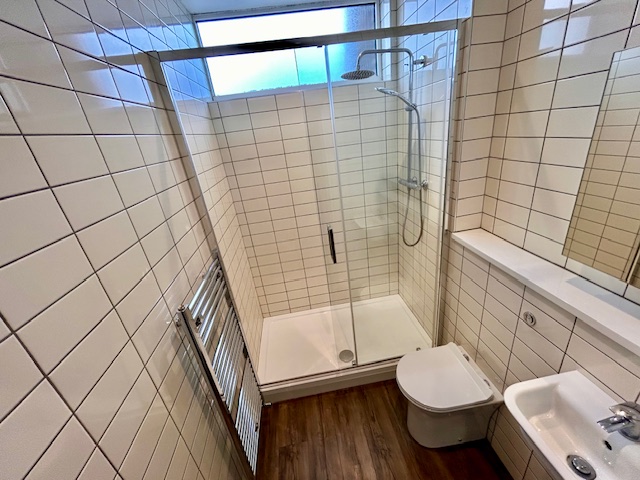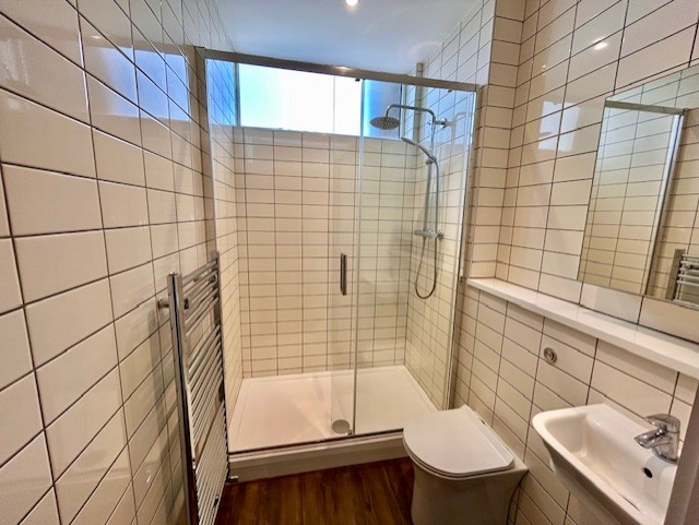 Modern fully tiled bathroom with large shower tray