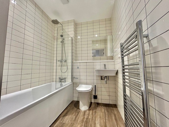 Modern fully tiled bathroom with shower over the bath