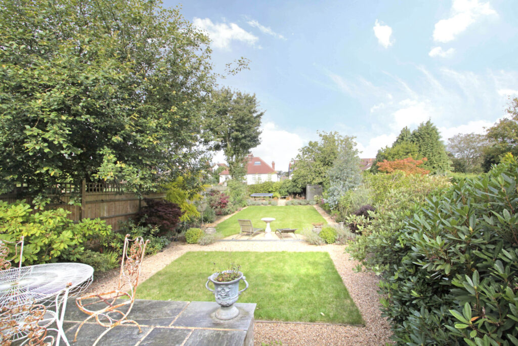 The house enters into a hallway with a sweeping staircase, to the front of the property there is a reception room with a bay window and an adjacent study. There is a further reception room with large windows overlooking the terrace and garden which accesses the impressive an particularly spacious open plan kitchen, with entertaining space 540 sq ft (52 sq m). with wonderful double aspect views of the garden and double-aspect French doors lead to the sandstone patio with steps lead down to an established garden extending to approximately 100 ft x 30 ft (30 m x 9 m), featuring two formal lawned areas, mature borders and trees, re-wilding and composting sections, and a garden shed. This beautifully landscaped garden offers a rare sense of space and privacy.