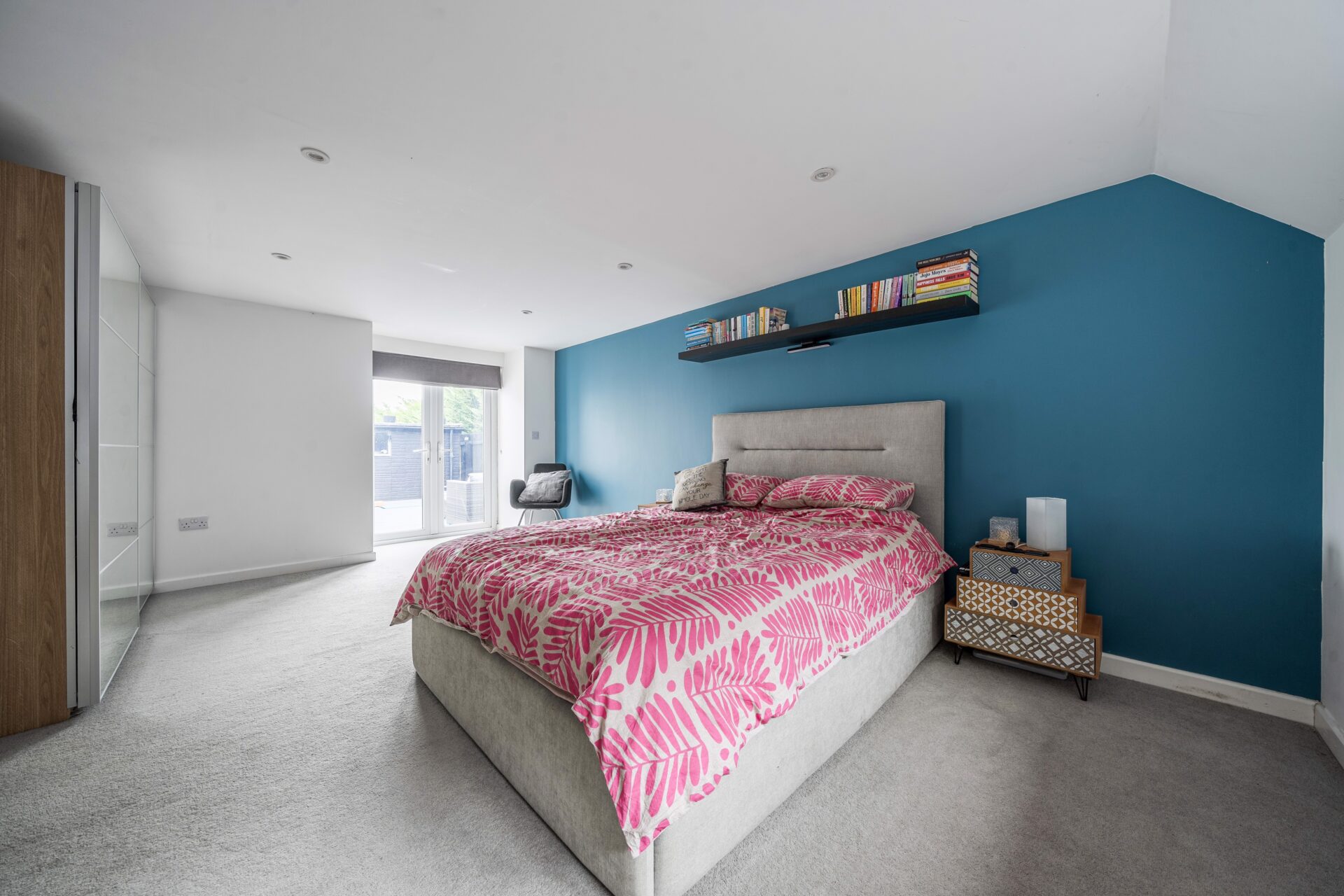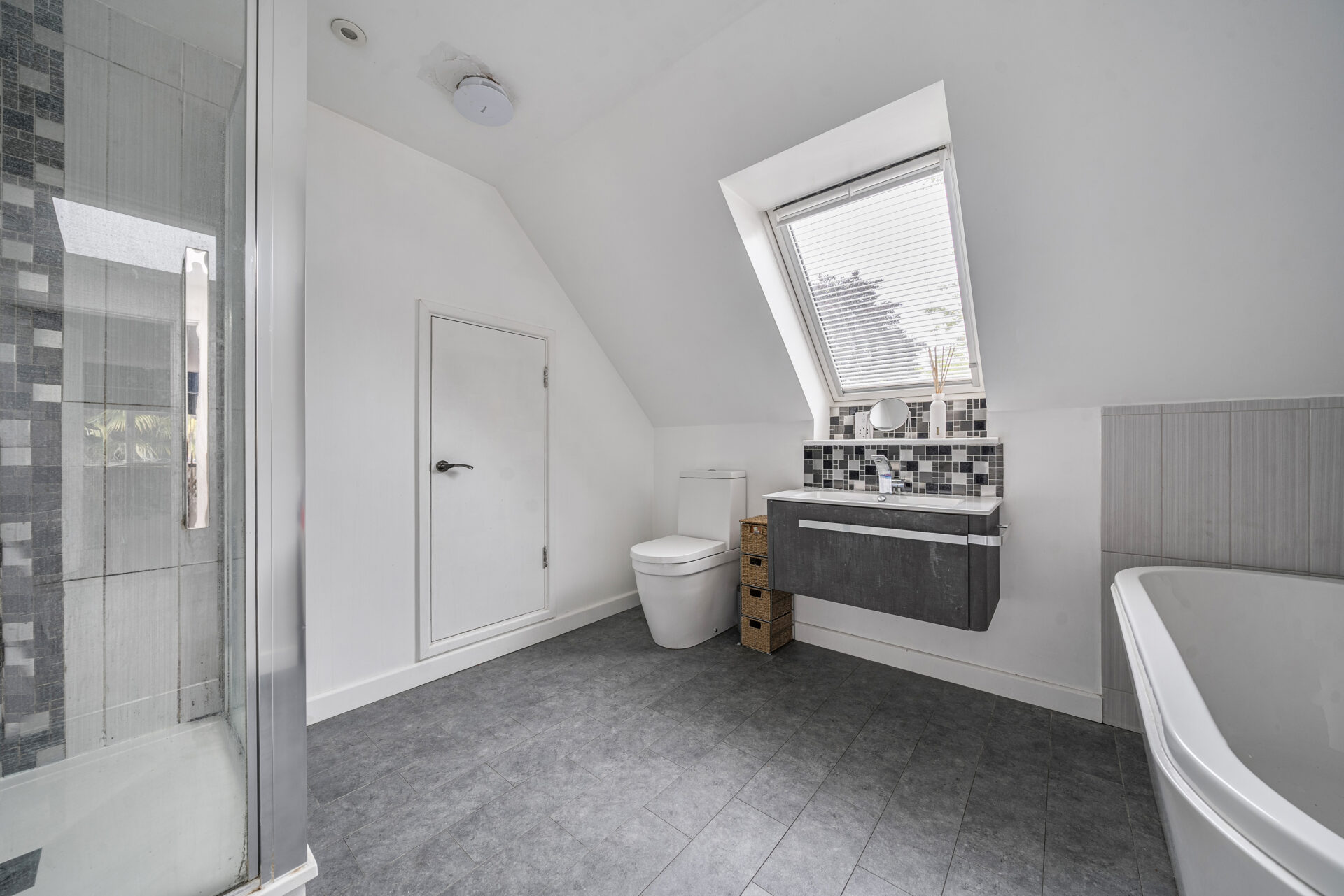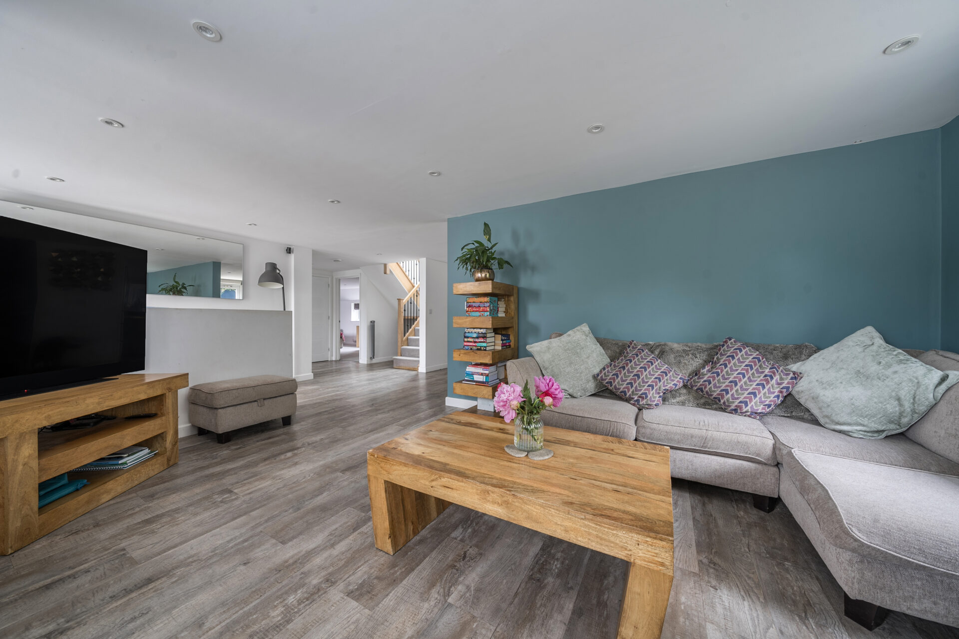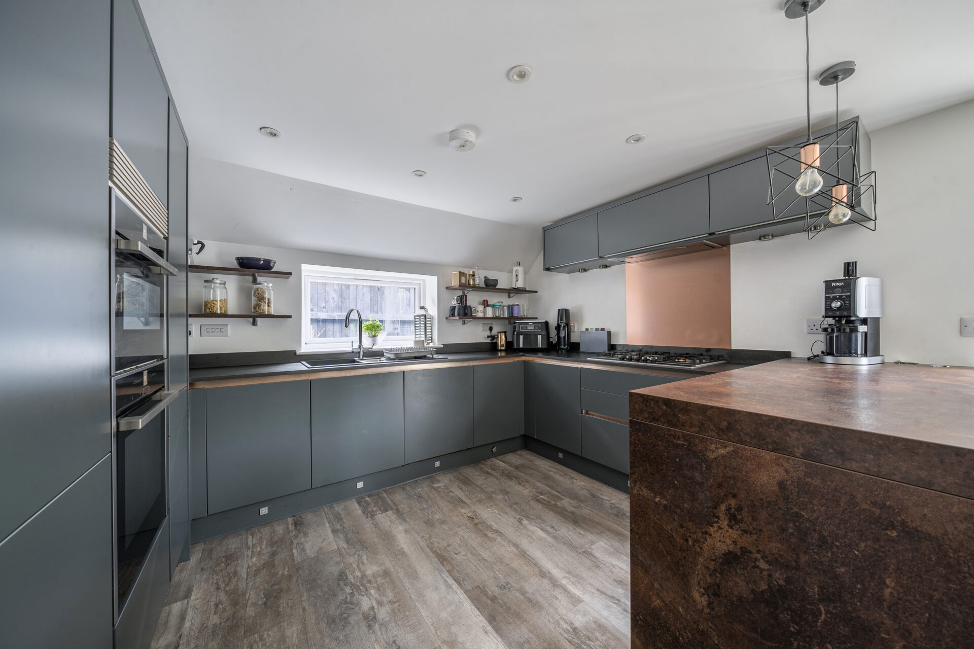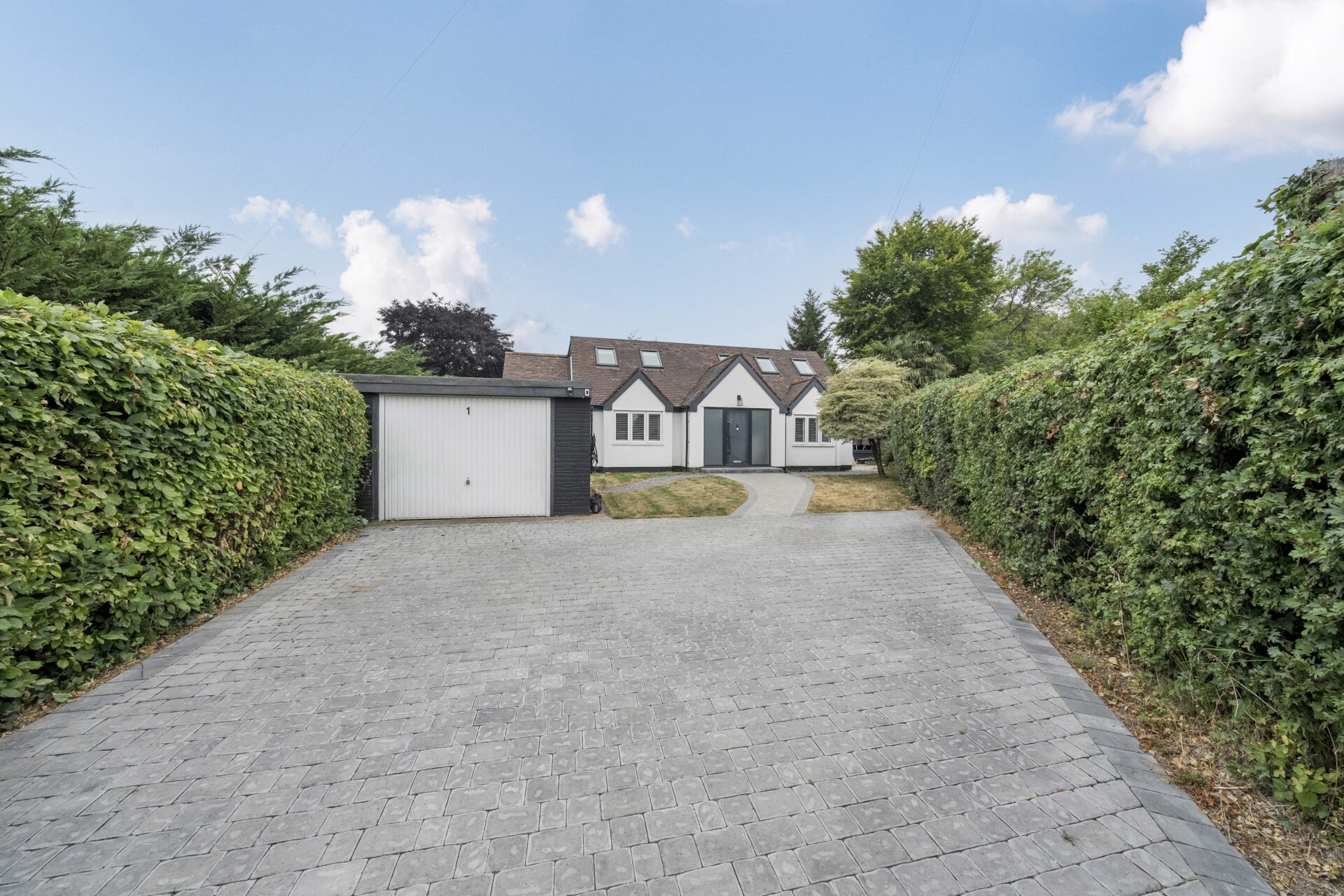Externally the property has a striking modern appearance with its attractive white render and anthracite grey windows & doors, setting it apart from the other houses on the road. To the front of the house, mature trees and shrubs create privacy, lead to a block paved driveway for several cars and a detached garage with electric car charging point and decked seating area. The side garden, landscaped to benefit from a raised terraced seating area with fence & hedge screening