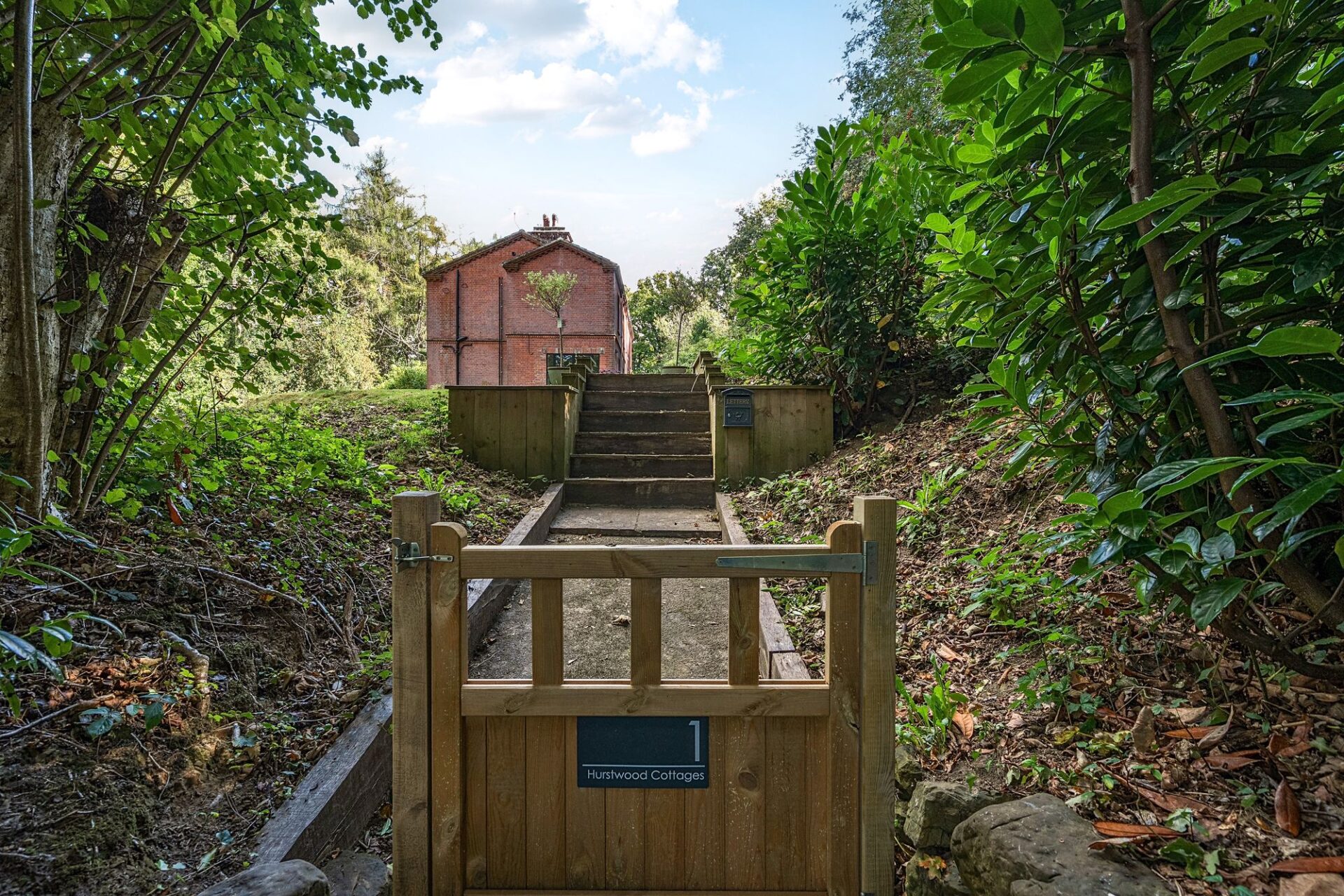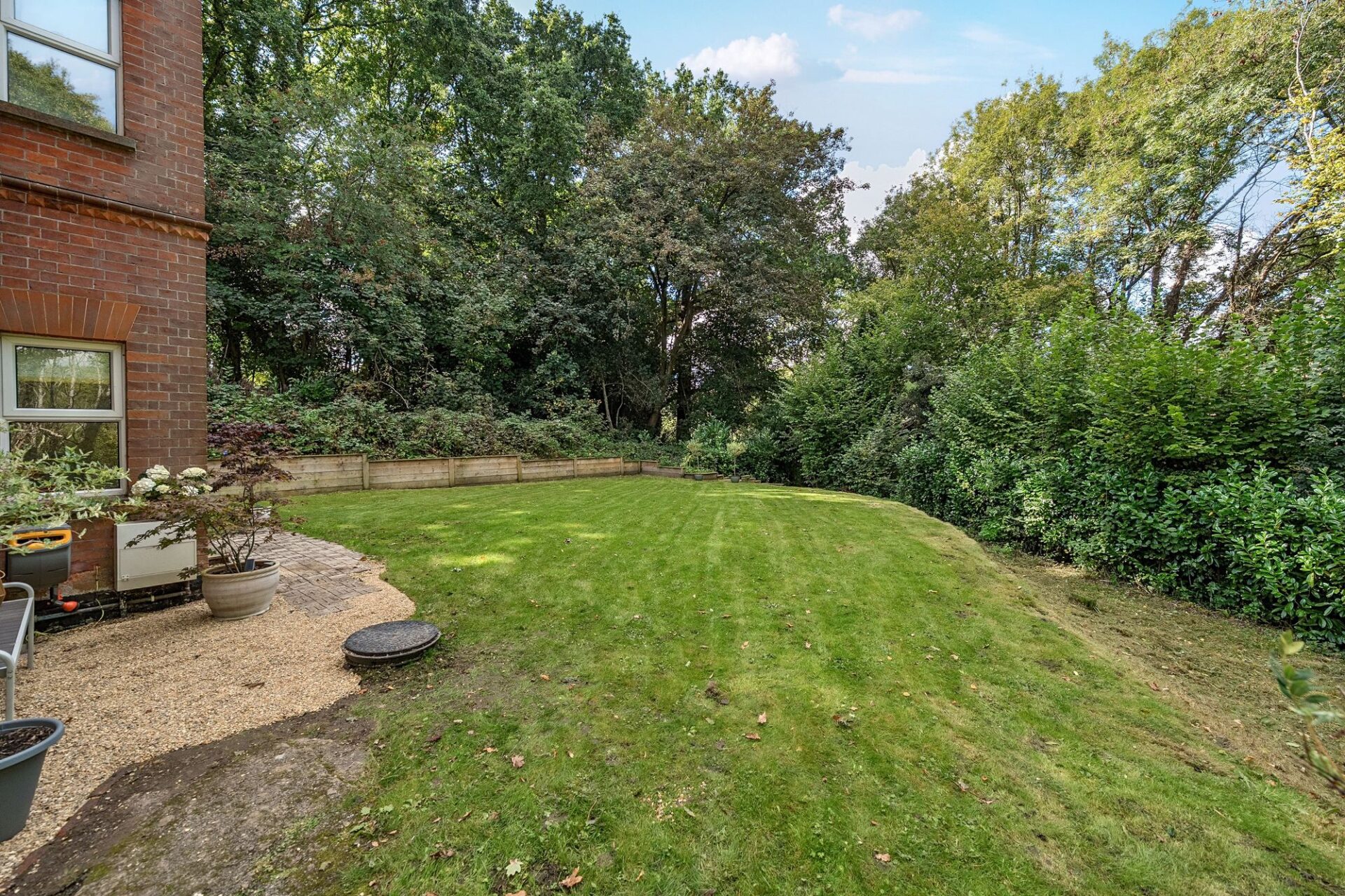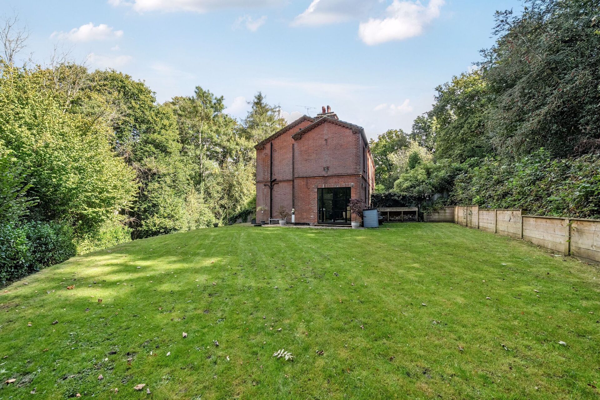 The garden is a most attractive feature and is set primarily to the side of the house with large level lawn, seating areas, steps and a footpath into Hurst Wood.