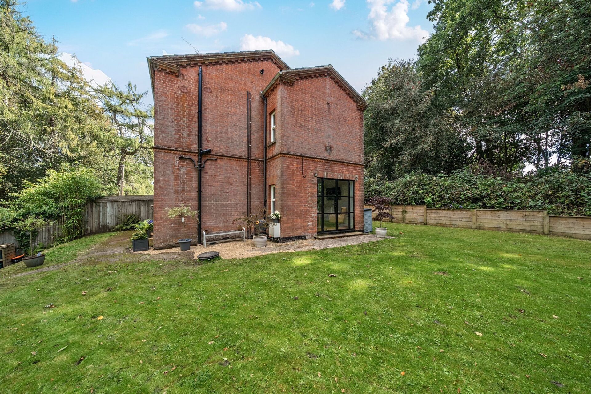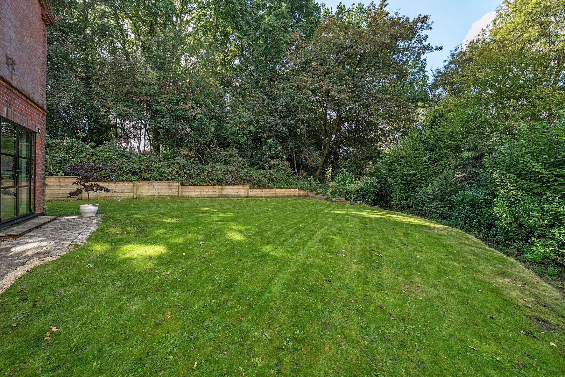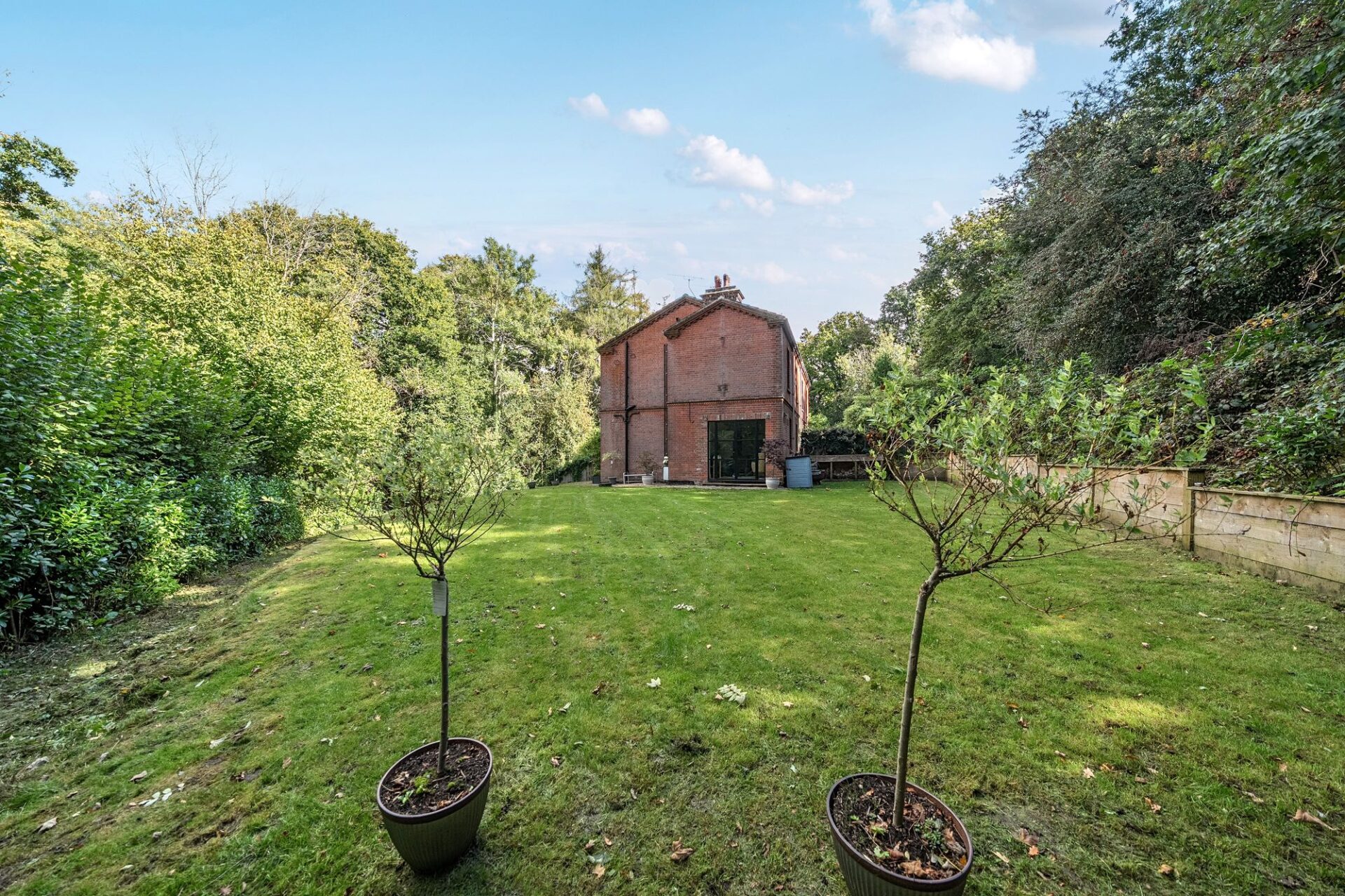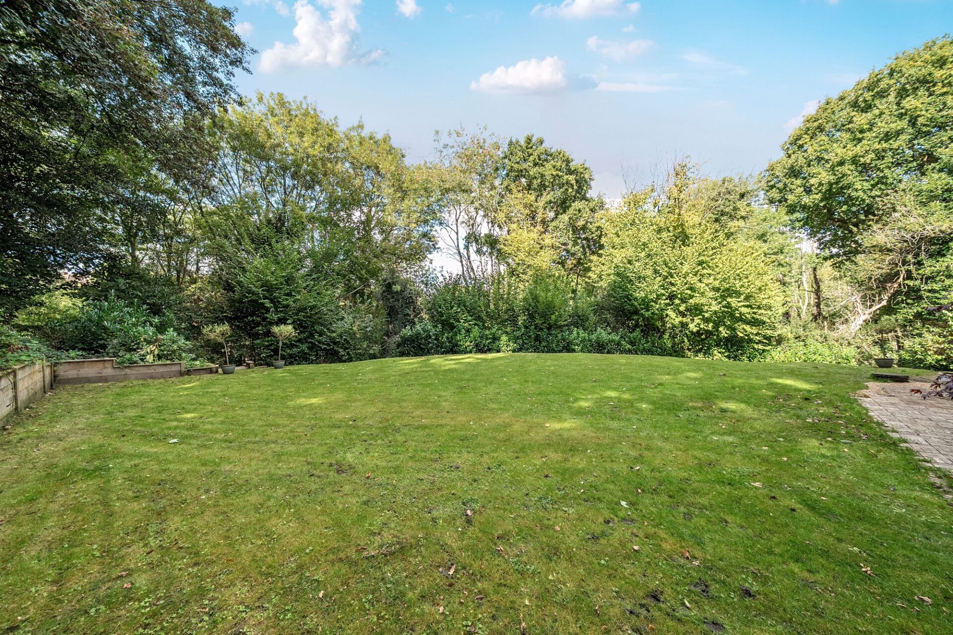 The garden is a most attractive feature and is set primarily to the side of the house with large level lawn, seating areas, steps and a footpath into Hurst Wood.